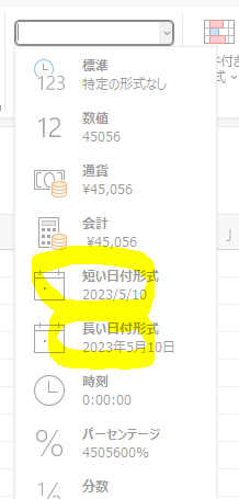 数値リボンの日付のνをクリック→短い日付形式