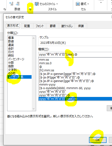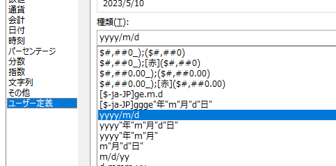 ユーザー定義をクリック→yyyy/m/d をクリック