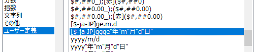 ユーザー定義をクリック→[$-ja-JP]ggge”年”m”月”d”日” をクリック
